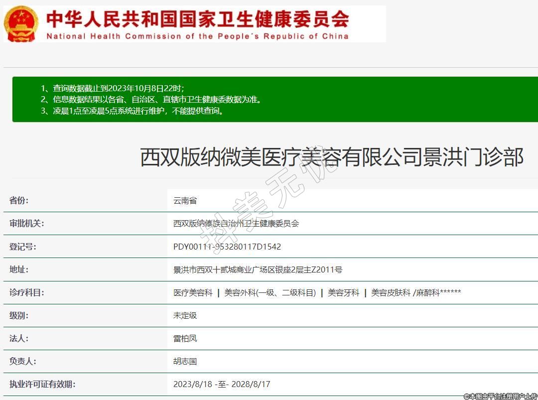 西双版纳微美医疗美容有限公司景洪门诊部,诊疗科目:医疗美容科 | 美容外科(一级、二级科目) | 美容牙科 | 美容皮肤科 /麻醉科******