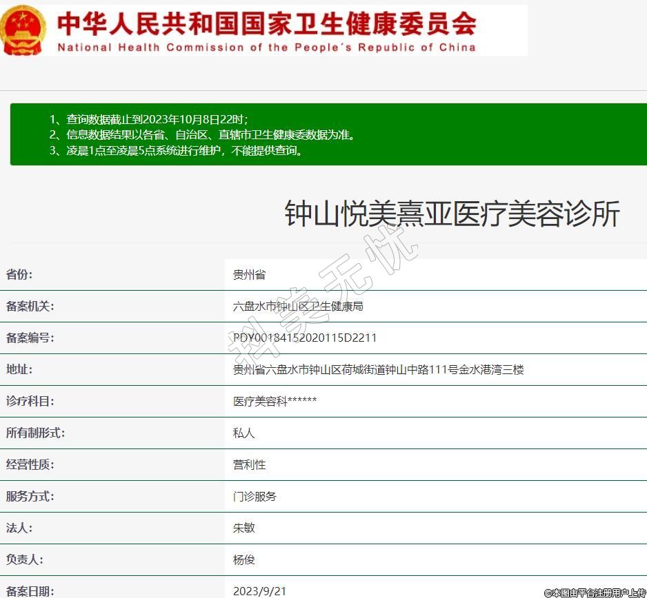 六盘水市悦美熹亚医疗美容服务有限公司位于贵州省六盘水市钟山区荷城街道钟山中路111号金水港湾三楼,诊疗科目:医疗美容科******