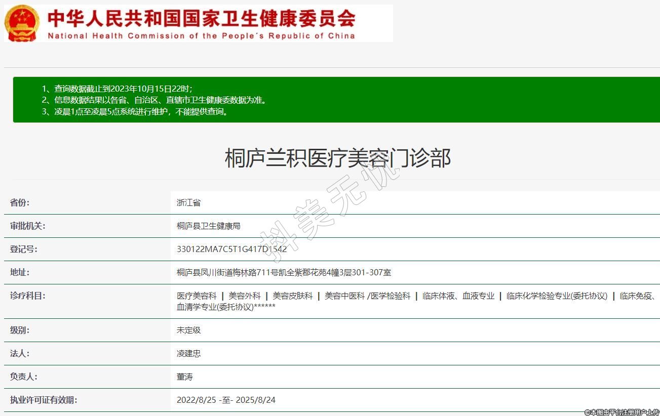 桐庐兰积医疗美容门诊部,诊疗科目:医疗美容科 | 美容外科 | 美容皮肤科 | 美容中医科 /医学检验科 | 临床体液、血液专业 | 临床化学检验专业(委托协议) | 临床免疫、血清学专业(委托协议)******