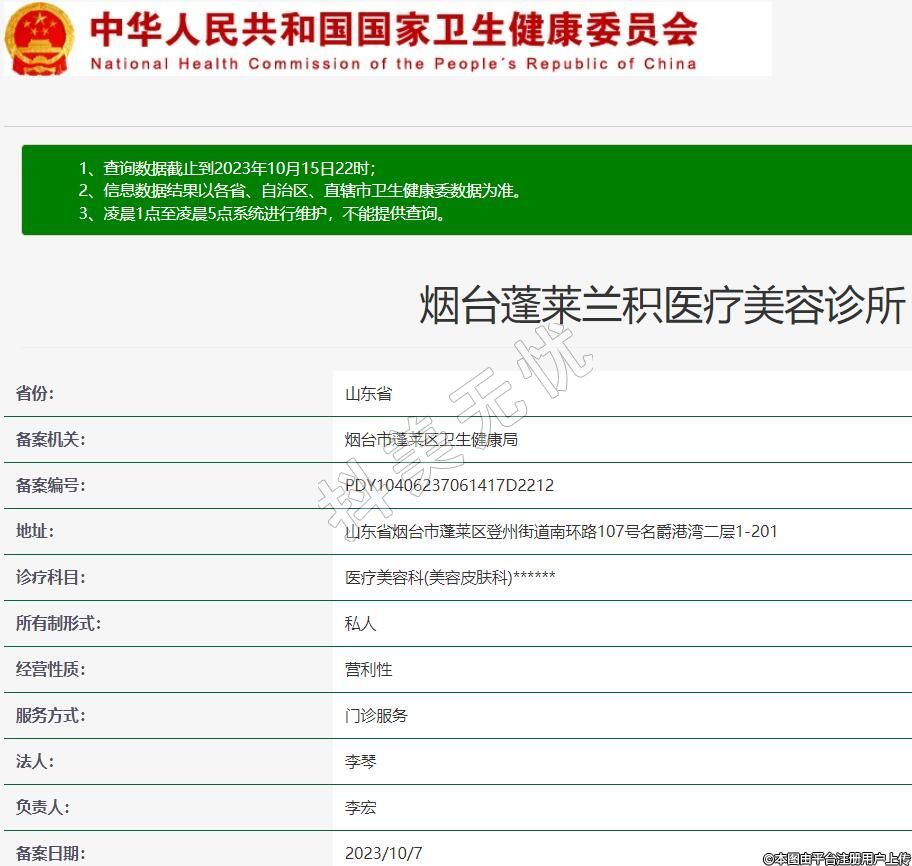 烟台蓬莱兰积医疗美容诊所,诊疗科目:医疗美容科(美容皮肤科)******
