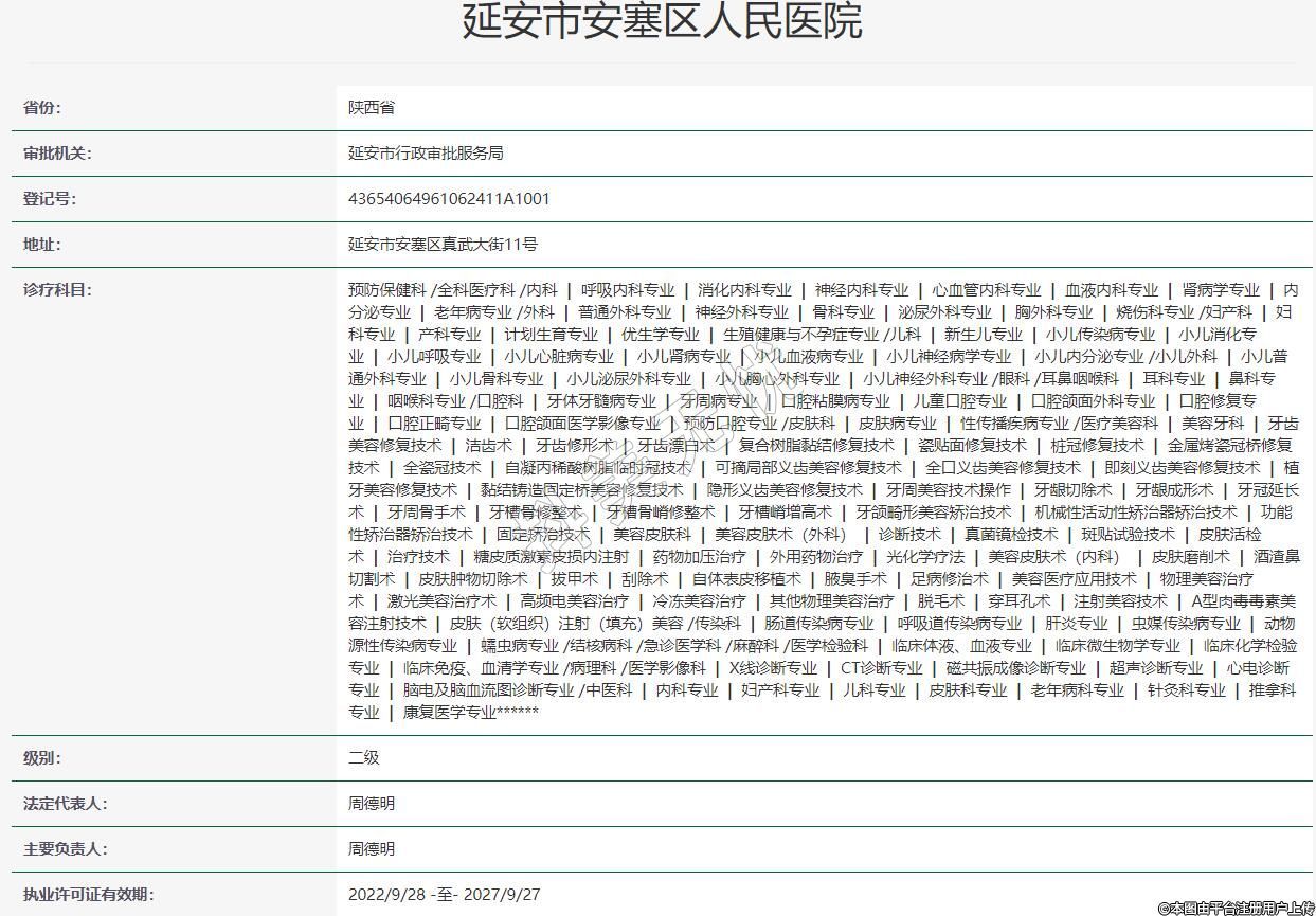 诊疗科目:预防保健科 /全科医疗科 /内科 | 呼吸内科专业 | 消化内科专业 | 神经内科专业 | 心血管内科专业 | 血液内科专业 | 肾病学专业 | 内分泌专业 | 老年病专业 /外科 | 普通外科专业 | 神经外科专业 | 骨科专业 | 泌尿外科专业 | 胸外科专业 | 烧伤科专业 /妇产科 | 妇科专业 | 产科专业 | 计划生育专业 | 优生学专业 | 生殖健康与不孕症专业 /儿科 | 新生儿专业 | 小儿传染病专业 | 小儿消化专业 | 小儿呼吸专业 | 小儿心脏病专业 | 小儿肾病专业 | 小儿血液病专业 | 小儿神经病学专业 | 小儿内分泌专业 /小儿外科 | 小儿普通外科专业 | 小儿骨科专业 | 小儿泌尿外科专业 | 小儿胸心外科专业 | 小儿神经外科专业 /眼科 /耳鼻咽喉科 | 耳科专业 | 鼻科专业 | 咽喉科专业 /口腔科 | 牙体牙髓病专业 | 牙周病专业 | 口腔粘膜病专业 | 儿童口腔专业 | 口腔颌面外科专业 | 口腔修复专业 | 口腔正畸专业 | 口腔颌面医学影像专业 | 预防口腔专业 /皮肤科 | 皮肤病专业 | 性传播疾病专业 /医疗美容科 | 美容牙科 | 牙齿美容修复技术 | 洁齿术 | 牙齿修形术 | 牙齿漂白术 | 复合树脂黏结修复技术 | 瓷贴面修复技术 | 桩冠修复技术 | 金属烤瓷冠桥修复技术 | 全瓷冠技术 | 自凝丙稀酸树脂临时冠技术 | 可摘局部义齿美容修复技术 | 全口义齿美容修复技术 | 即刻义齿美容修复技术 | 植牙美容修复技术 | 黏结铸造固定桥美容修复技术 | 隐形义齿美容修复技术 | 牙周美容技术操作 | 牙龈切除术 | 牙龈成形术 | 牙冠延长术 | 牙周骨手术 | 牙槽骨修整术 | 牙槽骨嵴修整术 | 牙槽嵴增高术 | 牙颌畸形美容矫治技术 | 机械性活动性矫治器矫治技术 | 功能性矫治器矫治技术 | 固定矫治技术 | 美容皮肤科 | 美容皮肤术(外科) | 诊断技术 | 真菌镜检技术 | 斑贴试验技术 | 皮肤活检术 | 治疗技术 | 糖皮质激素皮损内注射 | 药物加压治疗 | 外用药物治疗 | 光化学疗法 | 美容皮肤术(内科) | 皮肤磨削术 | 酒渣鼻切割术 | 皮肤肿物切除术 | 拔甲术 | 刮除术 | 自体表皮移植术 | 腋臭手术 | 足病修治术 | 美容医疗应用技术 | 物理美容治疗术 | 激光美容治疗术 | 高频电美容治疗 | 冷冻美容治疗 | 其他物理美容治疗 | 脱毛术 | 穿耳孔术 | 注射美容技术 | A型肉毒毒素美容注射技术 | 皮肤(软组织)注射(填充)美容 /传染科 | 肠道传染病专业 | 呼吸道传染病专业 | 肝炎专业 | 虫媒传染病专业 | 动物源性传染病专业 | 蠕虫病专业 /结核病科 /急诊医学科 /麻醉科 /医学检验科 | 临床体液、血液专业 | 临床微生物学专业 | 临床化学检验专业 | 临床免疫、血清学专业 /病理科 /医学影像科 | X线诊断专业 | CT诊断专业 | 磁共振成像诊断专业 | 超声诊断专业 | 心电诊断专业 | 脑电及脑血流图诊断专业 /中医科 | 内科专业 | 妇产科专业 | 儿科专业 | 皮肤科专业 | 老年病科专业 | 针灸科专业 | 推拿科专业 | 康复医学专业******