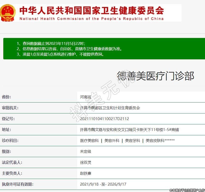 许昌德善美医疗美容门诊部于2020年成立,位于许昌市魏文路与安和街交叉口瑞贝卡新天下46#地11号楼1-5#商铺。是经过许昌市卫健部门批准设立的专业连锁整形机构。设有美容外科,皮肤美容科,激光科,毛发移植专科等多个临床科室。配有标准化的手术室观察室,药房,治疗室一应俱全。本院引进国际先进的整形美容技术和管理。与国内知名整形医院长期交流合作。让每一个爱美女士找到值得信赖的专家。
