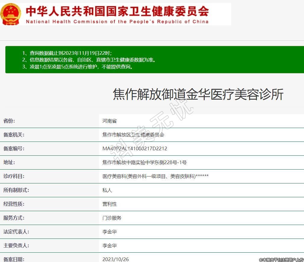 焦作解放御道金华医疗美容,历史名称:焦作市金华华美医疗美容。目前已开两个分店:焦作总店:焦东南路银都花园门口(市公积金北100米路西);武陟分店:武陟县兴华路与黄河大道交叉口(武陟宾馆东南角)。下设整形外科、光电美容科、抗衰老美容中心,注射美容中心。