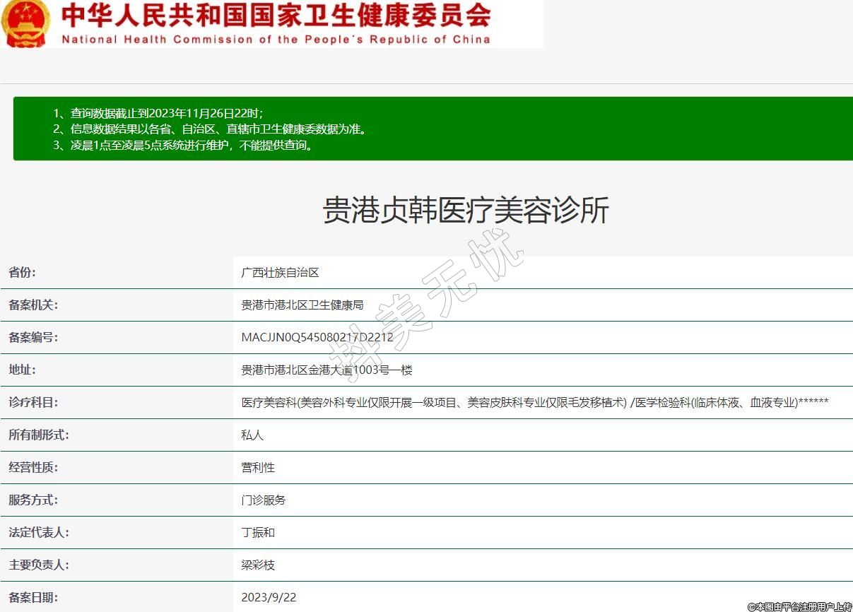 贵港贞韩医疗美容诊所,诊疗科目:医疗美容科(美容外科专业仅限开展一级项目、美容皮肤科专业仅限毛发移植术) /医学检验科(临床体液、血液专业)******