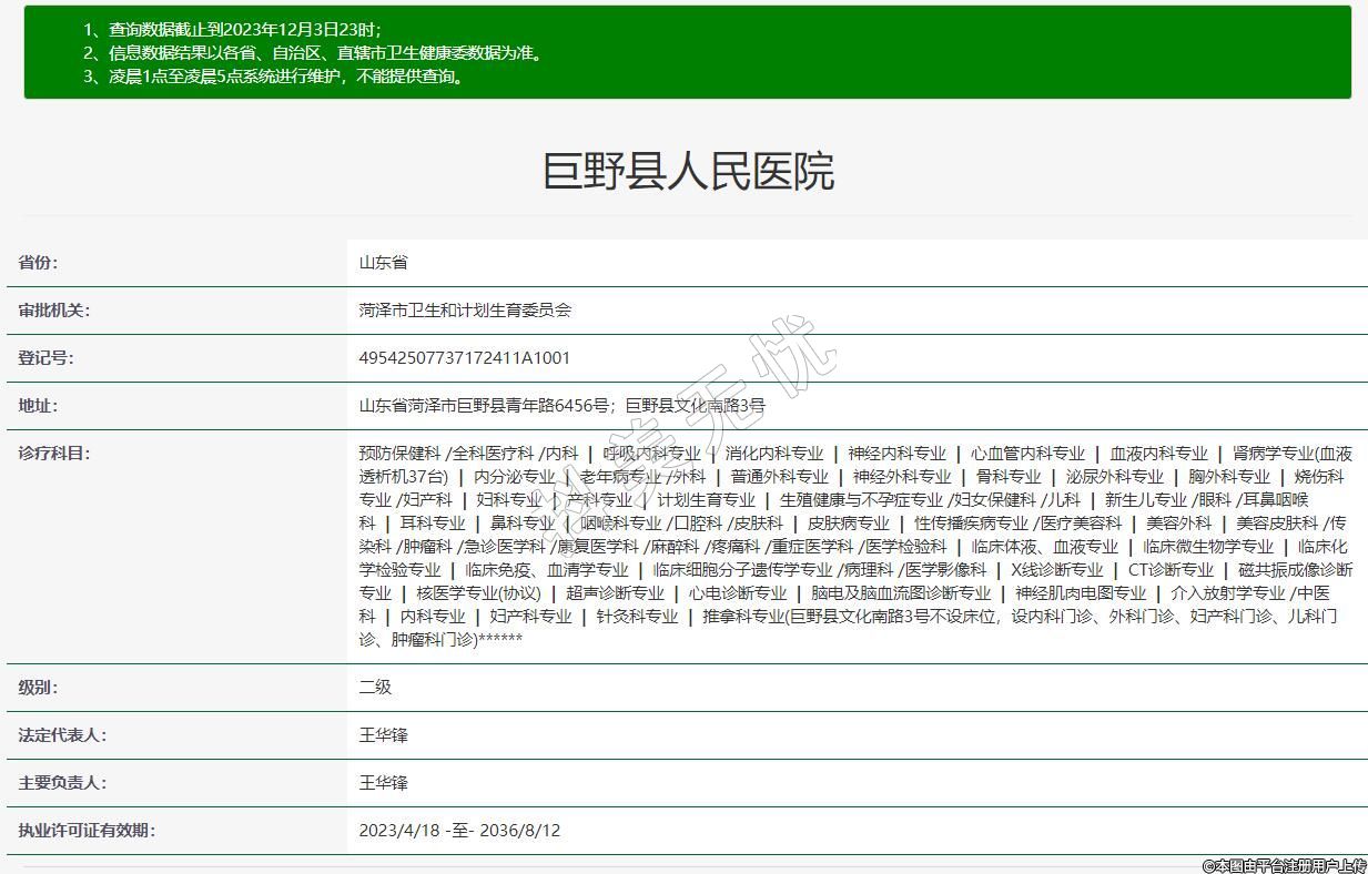 诊疗科目:预防保健科 /全科医疗科 /内科 | 呼吸内科专业 | 消化内科专业 | 神经内科专业 | 心血管内科专业 | 血液内科专业 | 肾病学专业(血液透析机37台) | 内分泌专业 | 老年病专业 /外科 | 普通外科专业 | 神经外科专业 | 骨科专业 | 泌尿外科专业 | 胸外科专业 | 烧伤科专业 /妇产科 | 妇科专业 | 产科专业 | 计划生育专业 | 生殖健康与不孕症专业 /妇女保健科 /儿科 | 新生儿专业 /眼科 /耳鼻咽喉科 | 耳科专业 | 鼻科专业 | 咽喉科专业 /口腔科 /皮肤科 | 皮肤病专业 | 性传播疾病专业 /医疗美容科 | 美容外科 | 美容皮肤科 /传染科 /肿瘤科 /急诊医学科 /康复医学科 /麻醉科 /疼痛科 /重症医学科 /医学检验科 | 临床体液、血液专业 | 临床微生物学专业 | 临床化学检验专业 | 临床免疫、血清学专业 | 临床细胞分子遗传学专业 /病理科 /医学影像科 | X线诊断专业 | CT诊断专业 | 磁共振成像诊断专业 | 核医学专业(协议) | 超声诊断专业 | 心电诊断专业 | 脑电及脑血流图诊断专业 | 神经肌肉电图专业 | 介入放射学专业 /中医科 | 内科专业 | 妇产科专业 | 针灸科专业 | 推拿科专业(巨野县文化南路3号不设床位,设内科门诊、外科门诊、妇产科门诊、儿科门诊、肿瘤科门诊)******