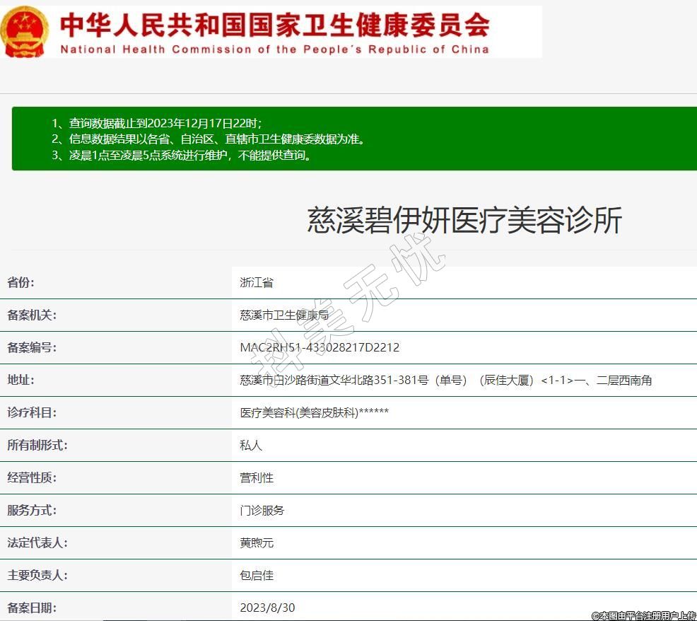 慈溪碧伊妍医疗美容诊所创办于2022年,统一社会信用代码:91330282MAC2RH5140,位于慈溪市白沙路街道文华北路351-381号(单号)(辰佳大厦)<1-1>一、二层西南角,是一家双美结合,于生活美容和医疗美容的高端医疗诊所,经营面积700平,希望把一线的服务质量给到慈溪的每一个求美顾客!