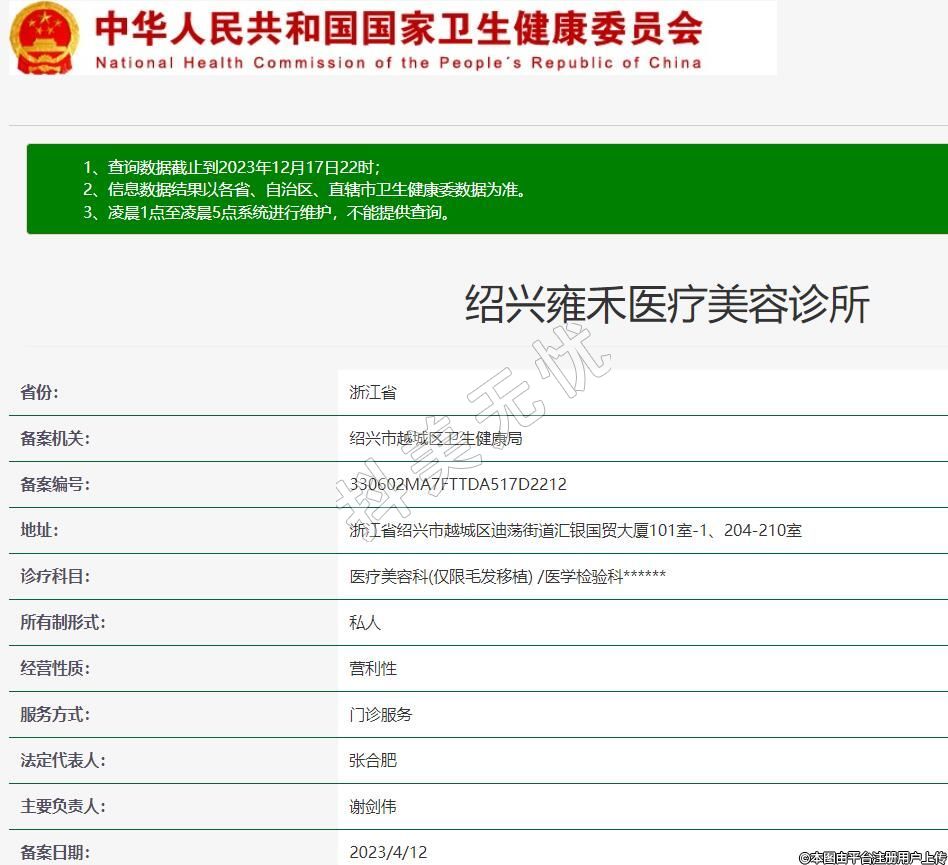 绍兴雍禾医疗美容诊所,诊疗科目:医疗美容科(仅限毛发移植) /医学检验科******