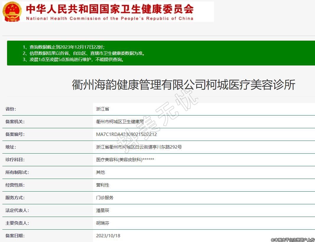 衢州海韵健康管理有限公司柯城医疗美容诊所,诊疗科目:医疗美容科(美容皮肤科)******
