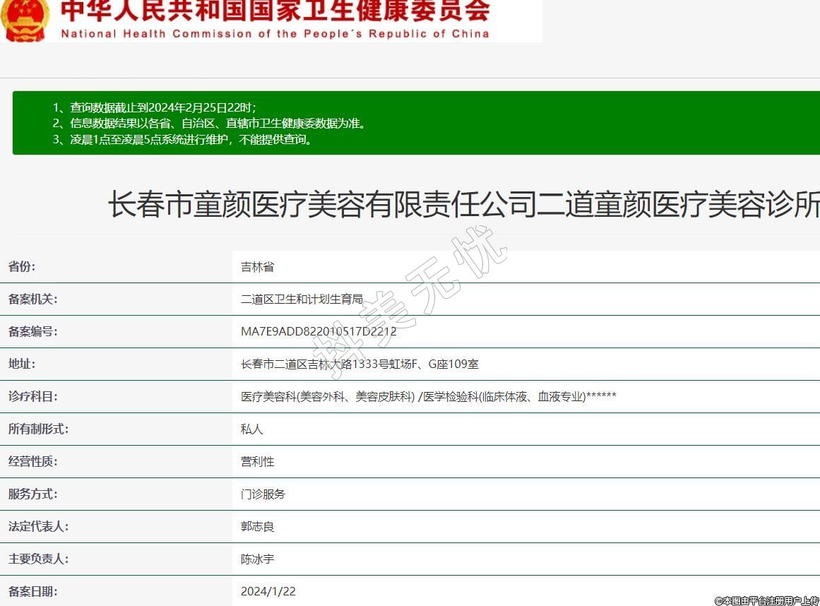 长春市童颜医疗美容有限责任公司二道童颜医疗美容诊所,诊疗科目:医疗美容科(美容外科、美容皮肤科) /医学检验科(临床体液、血液专业)******