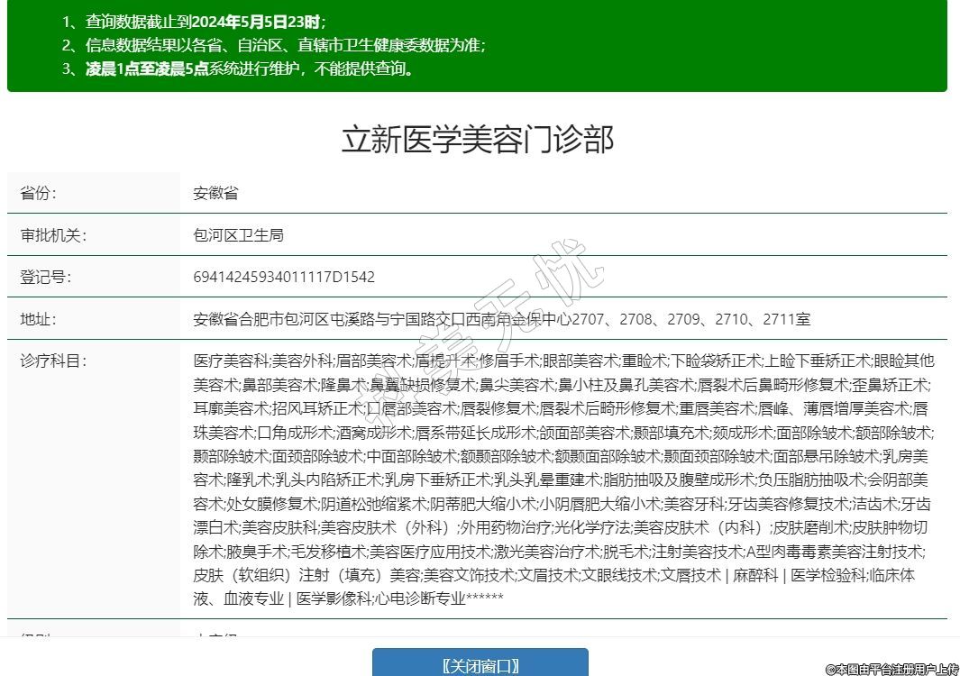 医疗美容科;美容外科;眉部美容术;眉提升术;修眉手术;眼部美容术;重睑术;下睑袋矫正术;上睑下垂矫正术;眼睑其他美容术;鼻部美容术;隆鼻术;鼻翼缺损修复术;鼻尖美容术;鼻小柱及鼻孔美容术;唇裂术后鼻畸形修复术;歪鼻矫正术;耳廓美容术;招风耳矫正术;口唇部美容术;唇裂修复术;唇裂术后畸形修复术;重唇美容术;唇峰、薄唇增厚美容术;唇珠美容术;口角成形术;酒窝成形术;唇系带延长成形术;颌面部美容术;颞部填充术;颏成形术;面部除皱术;额部除皱术;颞部除皱术;面颈部除皱术;中面部除皱术;额颞部除皱术;额颞面部除皱术;颞面颈部除皱术;面部悬吊除皱术;乳房美容术;隆乳术;乳头内陷矫正术;乳房下垂矫正术;乳头乳晕重建术;脂肪抽吸及腹壁成形术;负压脂肪抽吸术;会阴部美容术;处女膜修复术;阴道松弛缩紧术;阴蒂肥大缩小术;小阴唇肥大缩小术;美容牙科;牙齿美容修复技术;洁齿术;牙齿漂白术;美容皮肤科;美容皮肤术(外科);外用药物治疗;光化学疗法;美容皮肤术(内科);皮肤磨削术;皮肤肿物切除术;腋臭手术;毛发移植术;美容医疗应用技术;激光美容治疗术;脱毛术;注射美容技术;A型肉毒毒素美容注射技术;皮肤(软组织)注射(填充)美容;美容文饰技术;文眉技术;文眼线技术;文唇技术 | 麻醉科 | 医学检验科;临床体液、血液专业 | 医学影像科;心电诊断专业******