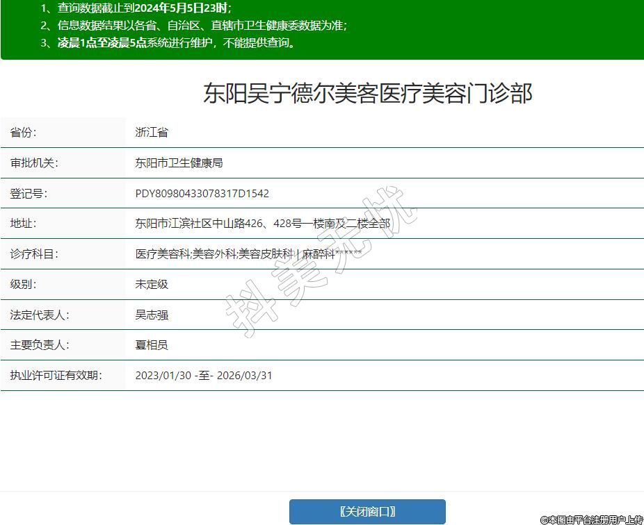 东阳吴宁德尔美客医疗美容门诊部,诊疗科目:医疗美容科;美容外科;美容皮肤科 | 麻醉科******