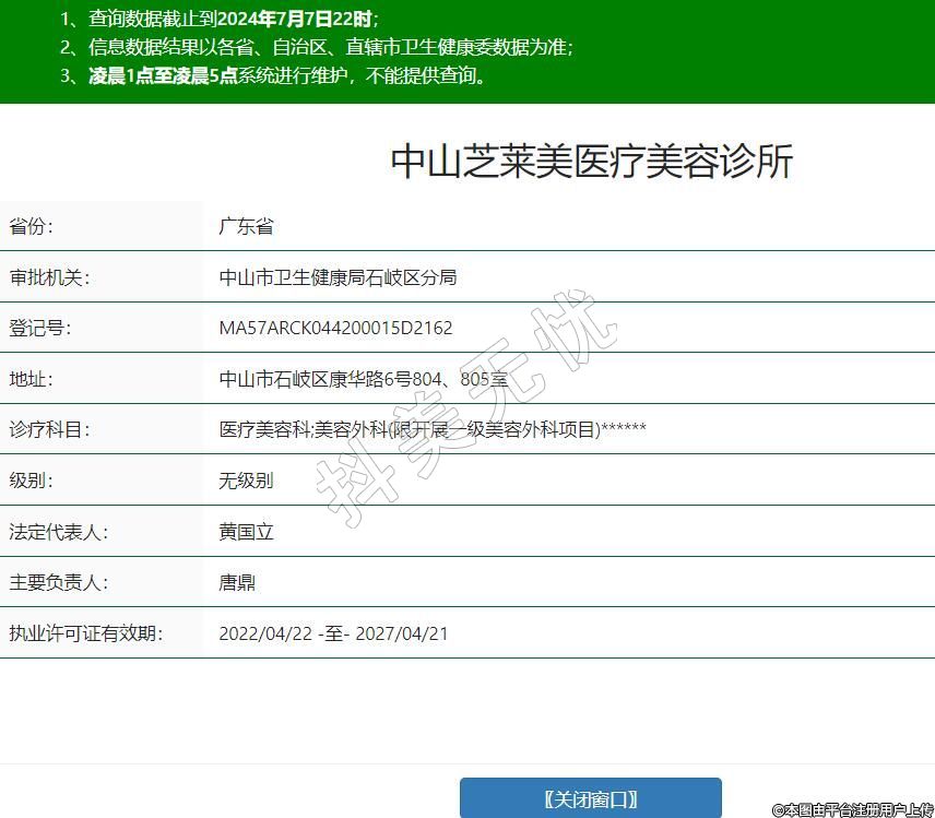 中山芝莱美医疗美容诊所,诊疗科目:医疗美容科;美容外科(限开展一级美容外科项目)******