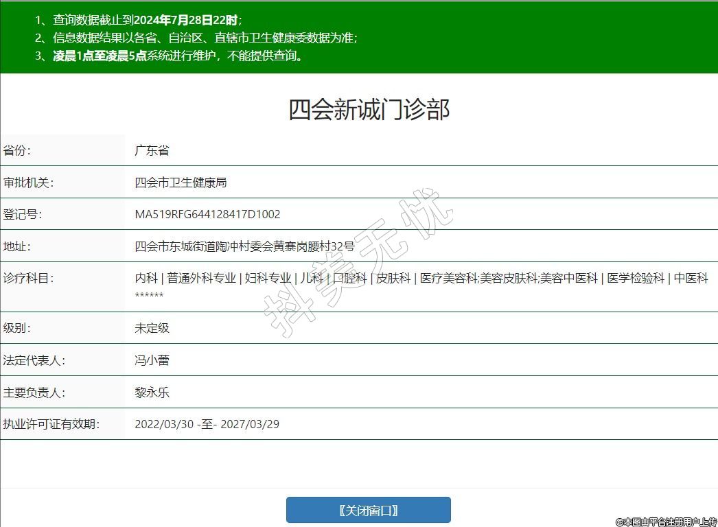 四会新诚门诊部,诊疗科目:内科 | 普通外科专业 | 妇科专业 | 儿科 | 口腔科 | 皮肤科 | 医疗美容科;美容皮肤科;美容中医科 | 医学检验科 | 中医科******