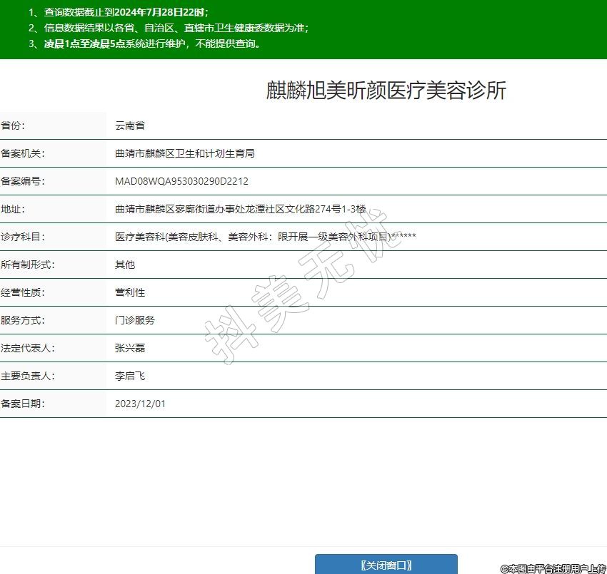 麒麟旭美昕颜医疗美容诊所,诊疗科目:医疗美容科(美容皮肤科、美容外科:限开展一级美容外科项目)******