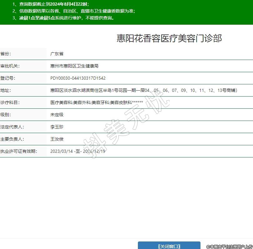 惠州花香容医疗美容门诊部于2019年成立,位于惠州市惠阳区淡水泗水湖滨商住区半岛1号花园一期1层04至13号商铺,是经惠州市卫健部门批准的正规医疗美容机构,云集了业内大咖专业医疗团队,同时配备麻醉科和高标准层流手术室。门诊拥有整形外科、注射科、皮肤美容科、麻醉科、口腔科五大科室。