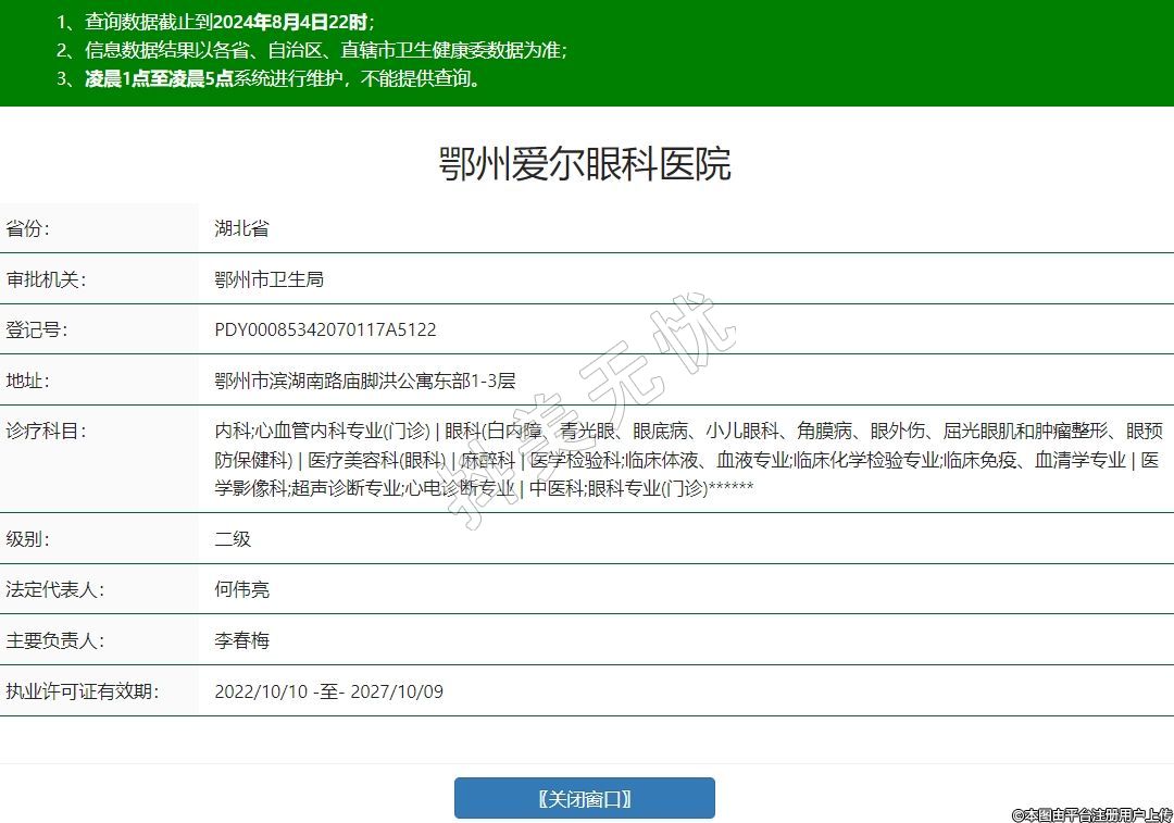 鄂州爱尔眼科医院,诊疗科目:内科;心血管内科专业(门诊) | 眼科(白内障、青光眼、眼底病、小儿眼科、角膜病、眼外伤、屈光眼肌和肿瘤整形、眼预防保健科) | 医疗美容科(眼科) | 麻醉科 | 医学检验科;临床体液、血液专业;临床化学检验专业;临床免疫、血清学专业 | 医学影像科;超声诊断专业;心电诊断专业 | 中医科;眼科专业(门诊)******