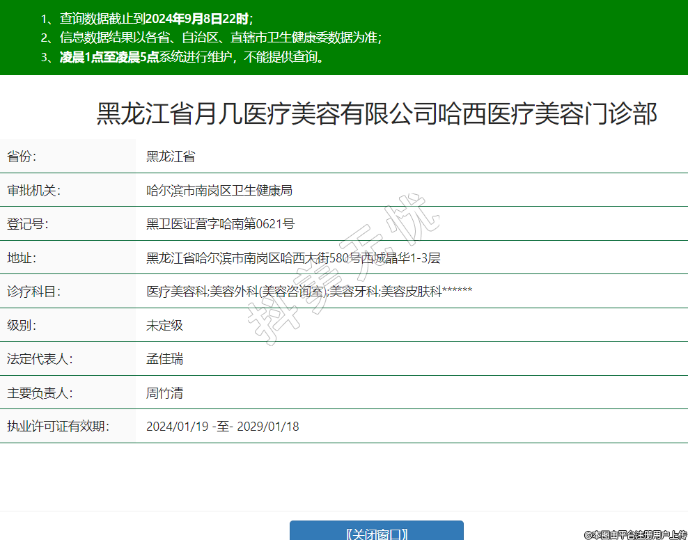 黑龙江省月几医疗美容有限公司哈西医疗美容门诊部,诊疗科目:医疗美容科;美容外科(美容咨询室);美容牙科;美容皮肤科******