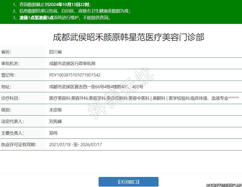 成都武侯昭禾颜原韩星范医疗美容门诊部是一家正规的、靠谱的医美机构,成都武侯原韩星范医疗美容门诊部有限公司成立于2016年02月25日,注册地位于成都市武侯区晋吉西一街66号4栋4楼,法定代表人为刘宪峰。