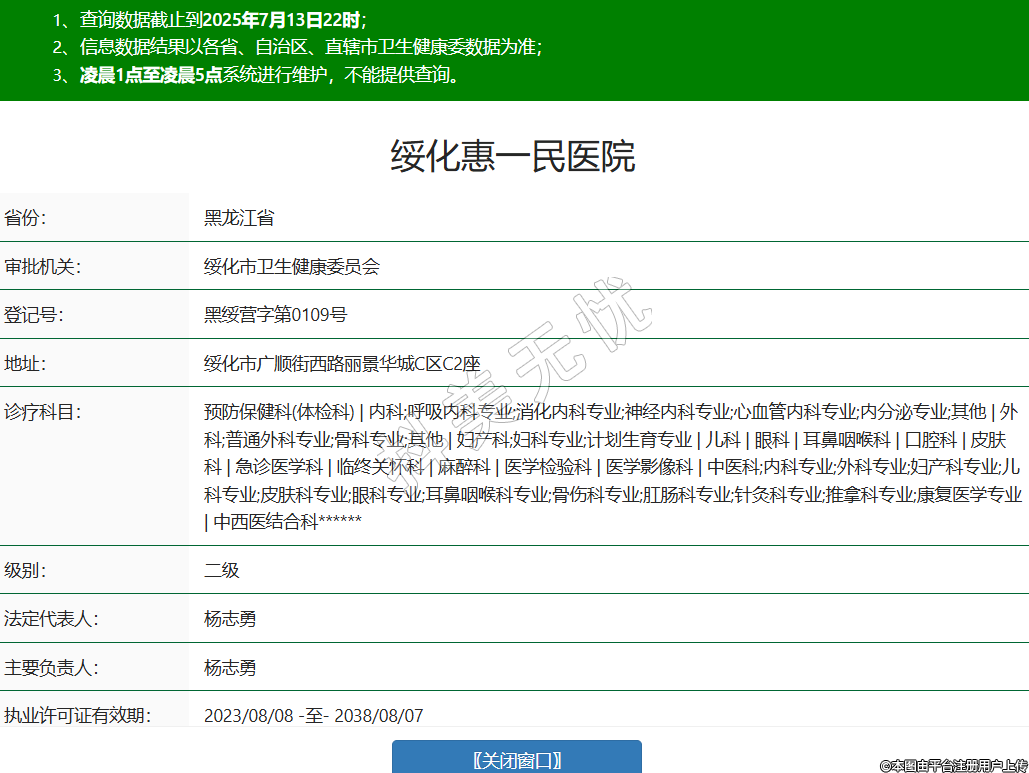 省份:黑龙江省审批机关:绥化市卫生健康委员会登记号:黑绥营字第0109号地址:绥化市广顺街西路丽景华城C区C2座诊疗科目:预防保健科(体检科) | 内科;呼吸内科专业;消化内科专业;神经内科专业;心血管内科专业;内分泌专业;其他 | 外科;普通外科专业;骨科专业;其他 | 妇产科;妇科专业;计划生育专业 | 儿科 | 眼科 | 耳鼻咽喉科 | 口腔科 | 皮肤科 | 急诊医学科 | 临终关怀科 | 麻醉科 | 医学检验科 | 医学影像科 | 中医科;内科专业;外科专业;妇产科专业;儿科专业;皮肤科专业;眼科专业;耳鼻咽喉科专业;骨伤科专业;肛肠科专业;针灸科专业;推拿科专业;康复医学专业 | 中西医结合科******级别:二级法定代表人:杨志勇主要负责人:杨志勇执业许可证有效期:2023/08/08 -至- 2038/08/07 -