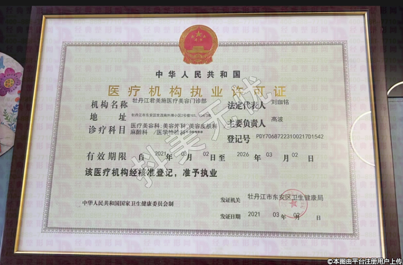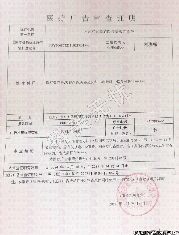 牡丹江君美施医疗美容门诊部,诊疗科目:医疗美容科;美容外科;美容皮肤科 | 麻醉科 | 医学检验科******