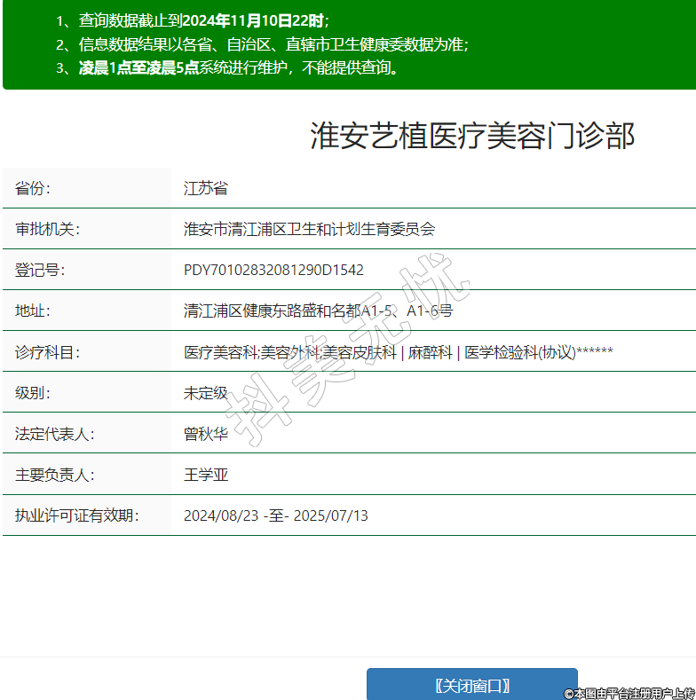 淮安艺植医疗美容门诊部,诊疗科目:医疗美容科;美容外科;美容皮肤科 | 麻醉科 | 医学检验科(协议)******