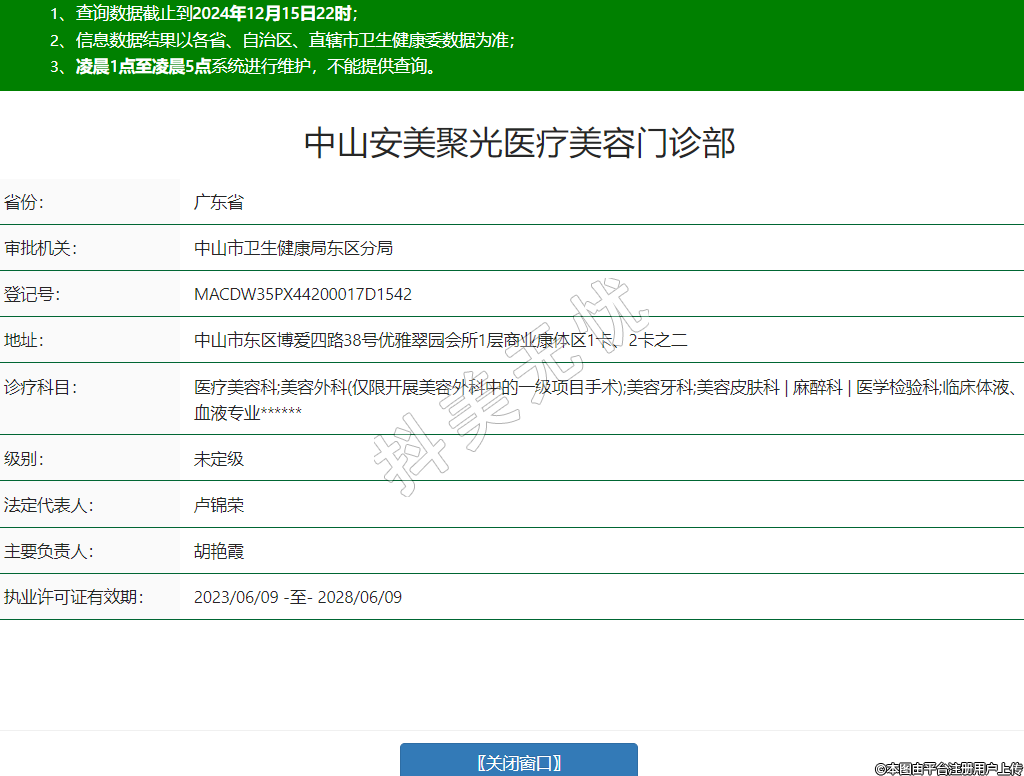 中山安美聚光医疗美容门诊部,诊疗科目:医疗美容科;美容外科(仅限开展美容外科中的一级项目手术);美容牙科;美容皮肤科 | 麻醉科 | 医学检验科;临床体液、血液专业******