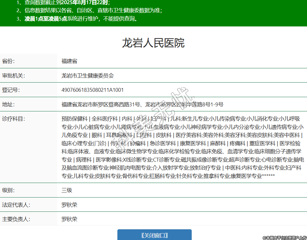 省份:福建省审批机关:龙岩市卫生健康委员会登记号:49076061835080211A1001地址:福建省龙岩市新罗区登高西路31号、龙岩市新罗区西城华莲路8号1-9号诊疗科目:预防保健科 | 全科医疗科 | 内科 | 外科 | 妇产科 | 儿科;新生儿专业;小儿传染病专业;小儿消化专业;小儿呼吸专业;小儿心脏病专业;小儿肾病专业;小儿血液病专业;小儿神经病学专业;小儿内分泌专业;小儿遗传病专业;小儿免疫专业 | 眼科 | 耳鼻咽喉科 | 口腔科 | 皮肤科 | 医疗美容科;美容外科;美容牙科;美容皮肤科;美容中医科 | 临床心理专业(门诊) | 传染科 | 肿瘤科 | 急诊医学科 | 康复医学科 | 麻醉科 | 疼痛科 | 重症医学科 | 医学检验科;临床体液、血液专业;临床微生物学专业;临床化学检验专业;临床免疫、血清学专业;临床细胞分子遗传学专业 | 病理科 | 医学影像科;X线诊断专业;CT诊断专业;磁共振成像诊断专业;超声诊断专业;心电诊断专业;脑电及脑血流图诊断专业;神经肌肉电图专业;介入放射学专业;放射治疗专业 | 中医科;内科专业;外科专业;妇产科专业;儿科专业;皮肤科专业;骨伤科专业;肛肠科专业;针灸科专业;推拿科专业;康复医学专业******级别:三级法定代表人:罗秋荣主要负责人:罗秋荣执业许可证有效期:2025/05/28 -至- 2031/05/27 -