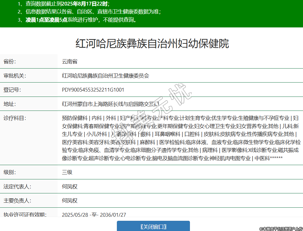 省份:云南省审批机关:红河哈尼族彝族自治州卫生健康委员会登记号:PDY90054553252211G1001地址:红河州蒙自市上海路延长线与启园路交叉口诊疗科目:预防保健科 | 内科 | 外科 | 妇产科;妇科专业;产科专业;计划生育专业;优生学专业;生殖健康与不孕症专业 | 妇女保健科;青春期保健专业;围产期保健专业;更年期保健专业;妇女心理卫生专业;妇女营养专业;其他 | 儿科;新生儿专业 | 小儿外科 | 儿童保健科 | 眼科 | 耳鼻咽喉科 | 口腔科 | 皮肤科;皮肤病专业;性传播疾病专业;其他 | 医疗美容科;美容牙科;美容皮肤科 | 麻醉科 | 医学检验科;临床体液、血液专业;临床微生物学专业;临床化学检验专业;临床免疫、血清学专业;临床细胞分子遗传学专业;其他 | 病理科 | 医学影像科;X线诊断专业;磁共振成像诊断专业;超声诊断专业;心电诊断专业;脑电及脑血流图诊断专业;神经肌肉电图专业 | 中医科******级别:三级法定代表人:何凤权主要负责人:何凤权执业许可证有效期:2025/05/28 -至- 2036/01/27 -