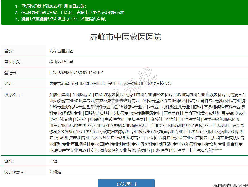 预防保健科 | 全科医疗科 | 内科;呼吸内科专业;消化内科专业;神经内科专业;心血管内科专业;血液内科专业;肾病学专业;内分泌专业;免疫学专业;变态反应专业;老年病专业 | 外科;普通外科专业;神经外科专业;骨科专业;泌尿外科专业;胸外科专业;烧伤科专业;整形外科专业 | 妇产科;妇科专业;产科专业 | 儿科;新生儿专业 | 眼科 | 耳鼻咽喉科;耳科专业;鼻科专业;咽喉科专业 | 口腔科 | 皮肤科;皮肤病专业;性传播疾病专业 | 医疗美容科;美容牙科;美容皮肤科;真菌镜检技术 | 精神科;其他 | 传染科 | 肿瘤科 | 急诊医学科 | 康复医学科 | 麻醉科 | 疼痛科 | 重症医学科 | 医学检验科;临床体液、血液专业;临床微生物学专业;临床化学检验专业;临床免疫、血清学专业;临床细胞分子遗传学专业 | 病理科 | 医学影像科;X线诊断专业;CT诊断专业;磁共振成像诊断专业;核医学专业;超声诊断专业;心电诊断专业;脑电及脑血流图诊断专业;神经肌肉电图专业;介入放射学专业;放射治疗专业 | 中医科;内科专业;外科专业;妇产科专业;儿科专业;皮肤科专业;眼科专业;耳鼻咽喉科专业;口腔科专业;肿瘤科专业;骨伤科专业;肛肠科专业;老年病科专业;针灸科专业;推拿科专业;康复医学专业;急诊科专业;预防保健科专业;其他(脑病科) | 民族医学科;蒙医学 | 中西医结合科******