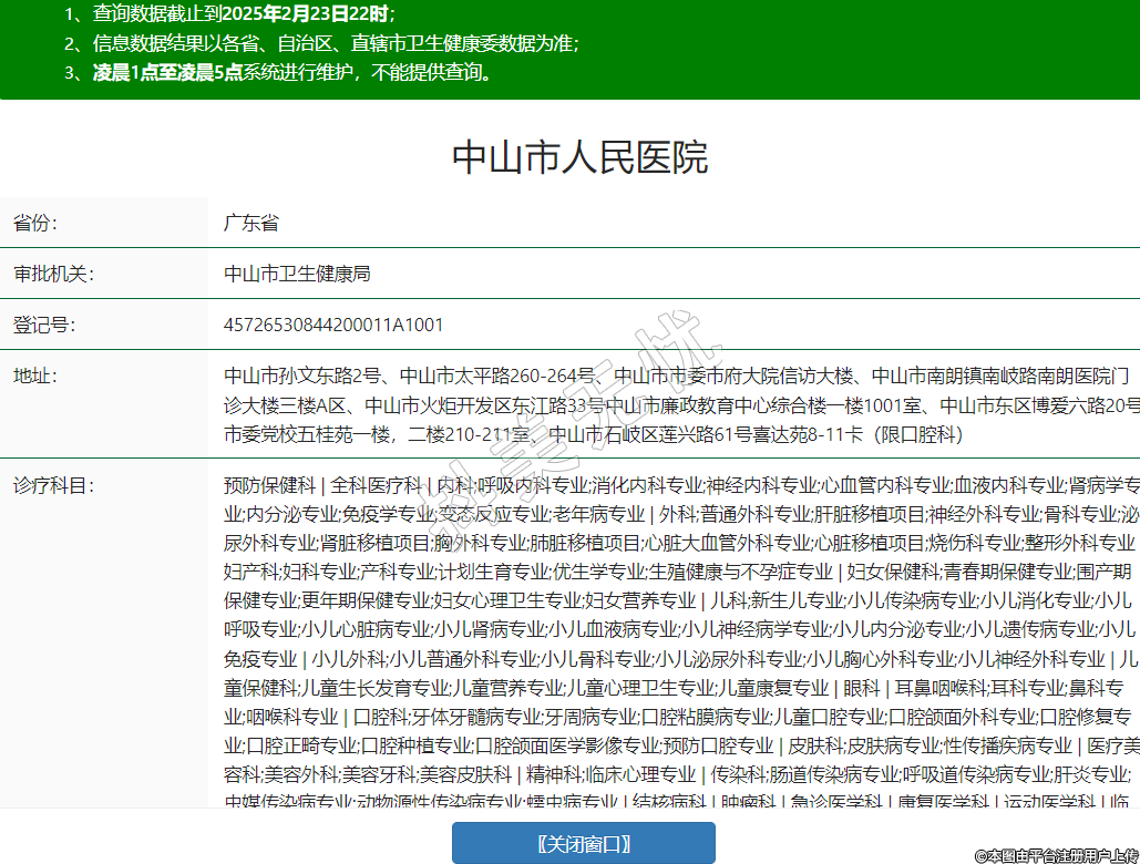 中山市孙文东路2号、中山市太平路260-264号、中山市市委市府大院信访大楼、中山市南朗镇南岐路南朗医院门诊大楼三楼A区、中山市火炬开发区东江路33号中山市廉政教育中心综合楼一楼1001室、中山市东区博爱六路20号市委党校五桂苑一楼,二楼210-211室、中山市石岐区莲兴路61号喜达苑8-11卡(限口腔科)