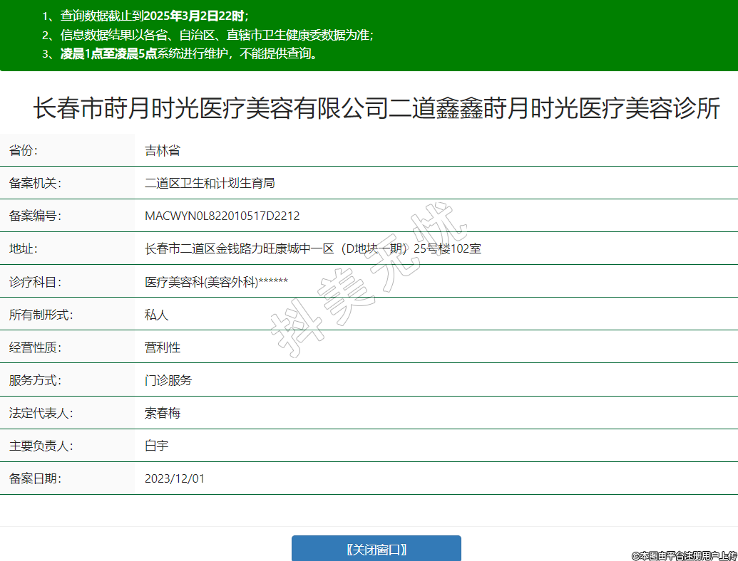 长春市莳月时光医疗美容有限公司二道鑫鑫莳月时光医疗美容诊所,诊疗科目:医疗美容科(美容皮肤科)******