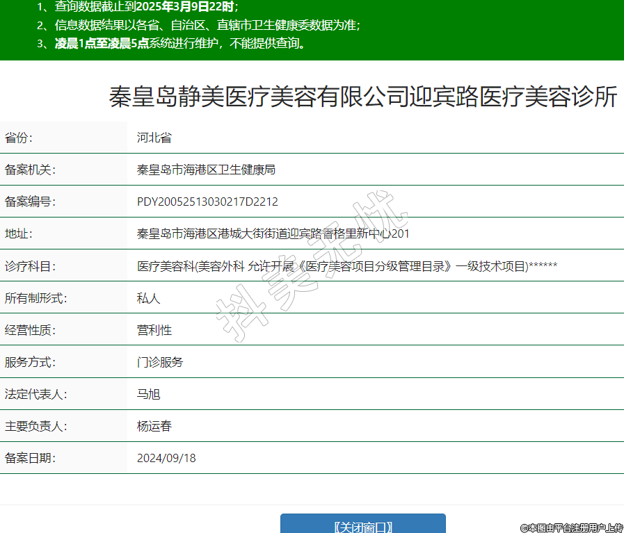秦皇岛静美医疗美容有限公司迎宾路医疗美容诊所,诊疗科目:医疗美容科(美容外科 允许开展《医疗美容项目分级管理目录》一级技术项目)******