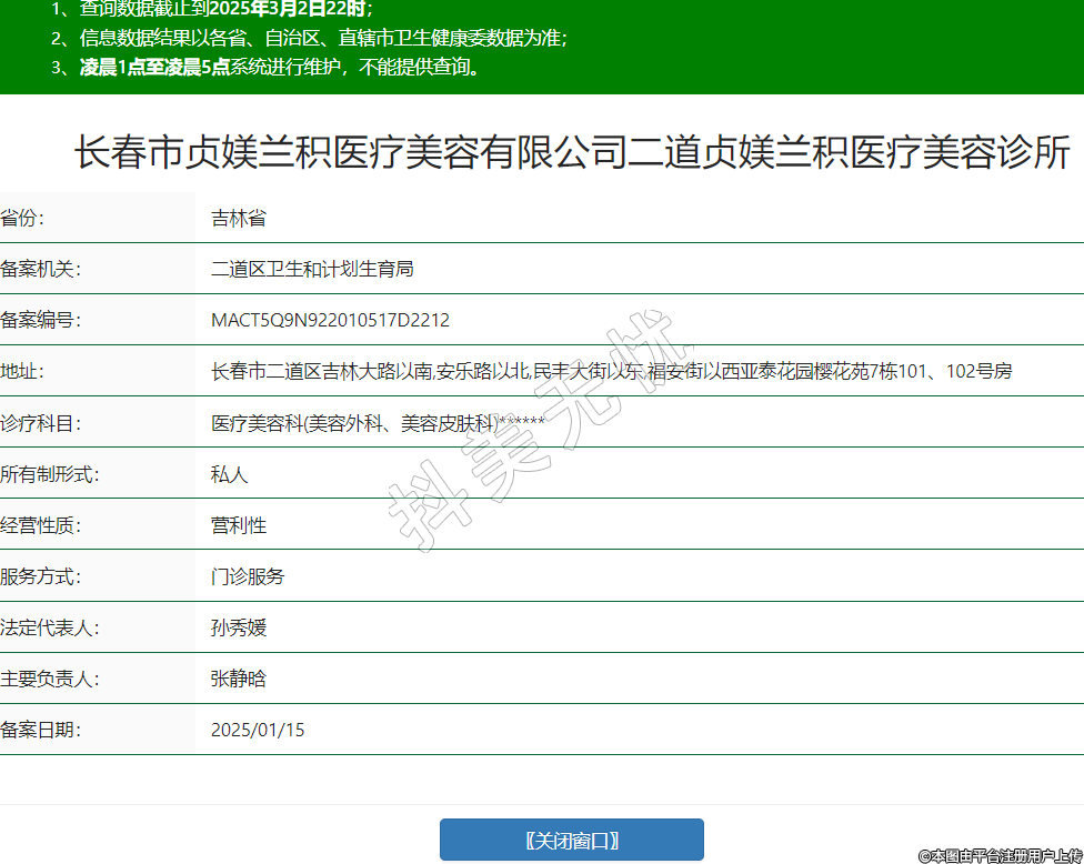 长春市贞媄兰积医疗美容有限公司二道贞媄兰积医疗美容诊所,诊疗科目:医疗美容科(美容外科、美容皮肤科)******