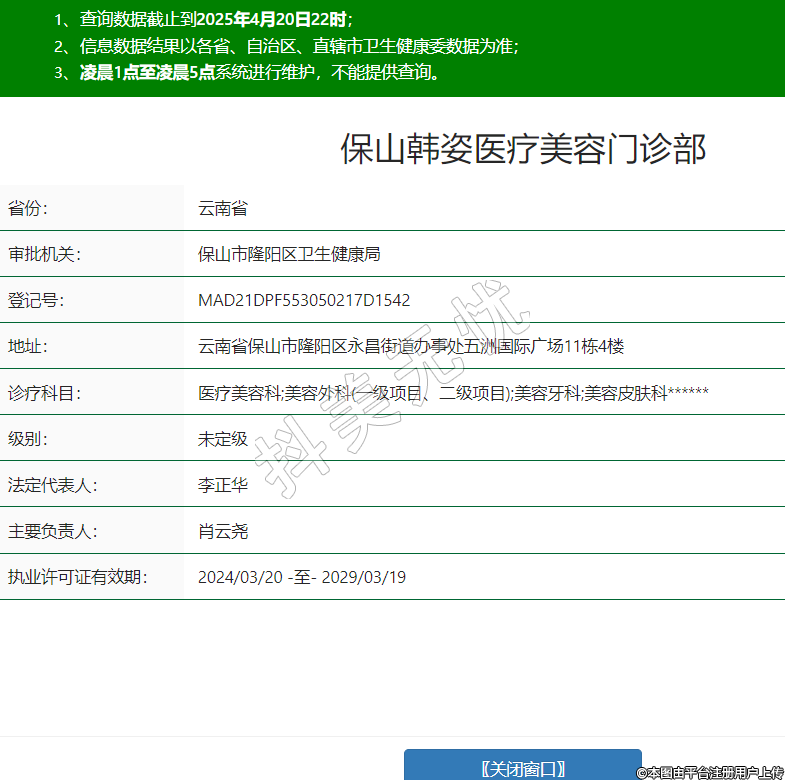 保山韩姿医疗美容门诊部,诊疗科目:医疗美容科;美容外科(一级项目、二级项目);美容牙科;美容皮肤科******