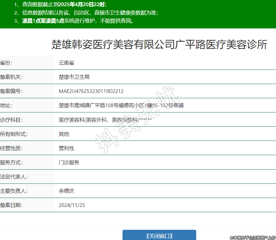 楚雄韩姿医疗美容有限公司广平路医疗美容诊所,诊疗科目:医疗美容科(美容外科、美容皮肤科)******