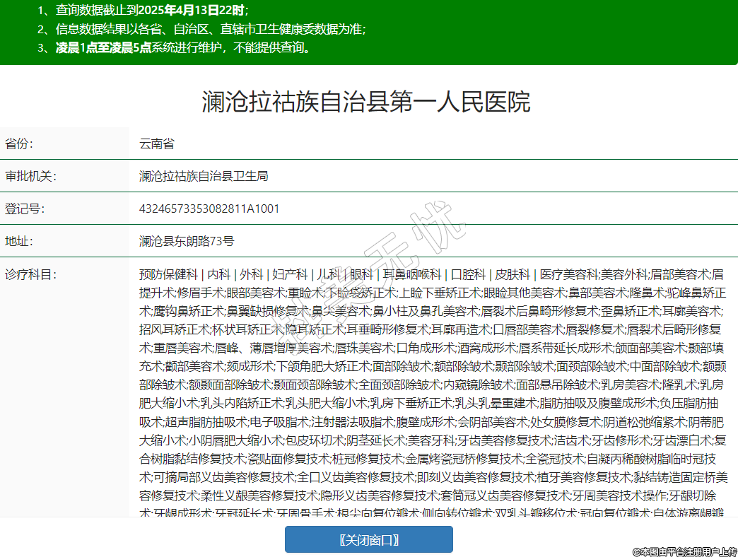 预防保健科 | 内科 | 外科 | 妇产科 | 儿科 | 眼科 | 耳鼻咽喉科 | 口腔科 | 皮肤科 | 医疗美容科;美容外科;眉部美容术;眉提升术;修眉手术;眼部美容术;重睑术;下睑袋矫正术;上睑下垂矫正术;眼睑其他美容术;鼻部美容术;隆鼻术;驼峰鼻矫正术;鹰钩鼻矫正术;鼻翼缺损修复术;鼻尖美容术;鼻小柱及鼻孔美容术;唇裂术后鼻畸形修复术;歪鼻矫正术;耳廓美容术;招风耳矫正术;杯状耳矫正术;隐耳矫正术;耳垂畸形修复术;耳廓再造术;口唇部美容术;唇裂修复术;唇裂术后畸形修复术;重唇美容术;唇峰、薄唇增厚美容术;唇珠美容术;口角成形术;酒窝成形术;唇系带延长成形术;颌面部美容术;颞部填充术;颧部美容术;颏成形术;下颌角肥大矫正术;面部除皱术;额部除皱术;颞部除皱术;面颈部除皱术;中面部除皱术;额颞部除皱术;额颞面部除皱术;颞面颈部除皱术;全面颈部除皱术;内窥镜除皱术;面部悬吊除皱术;乳房美容术;隆乳术;乳房肥大缩小术;乳头内陷矫正术;乳头肥大缩小术;乳房下垂矫正术;乳头乳晕重建术;脂肪抽吸及腹壁成形术;负压脂肪抽吸术;超声脂肪抽吸术;电子吸脂术;注射器法吸脂术;腹壁成形术;会阴部美容术;处女膜修复术;阴道松弛缩紧术;阴蒂肥大缩小术;小阴唇肥大缩小术;包皮环切术;阴茎延长术;美容牙科;牙齿美容修复技术;洁齿术;牙齿修形术;牙齿漂白术;复合树脂黏结修复技术;瓷贴面修复技术;桩冠修复技术;金属烤瓷冠桥修复技术;全瓷冠技术;自凝丙稀酸树脂临时冠技术;可摘局部义齿美容修复技术;全口义齿美容修复技术;即刻义齿美容修复技术;植牙美容修复技术;黏结铸造固定桥美容修复技术;柔性义龈美容修复技术;隐形义齿美容修复技术;套筒冠义齿美容修复技术;牙周美容技术操作;牙龈切除术;牙龈成形术;牙冠延长术;牙周骨手术;根尖向复位瓣术;侧向转位瓣术;双乳头瓣移位术;冠向复位瓣术;自体游离龈瓣移植术;牙周引导组织再生术;牙槽骨修整术;牙槽骨嵴修整术;牙槽嵴增高术;牙颌畸形美容矫治技术;机械性活动性矫治器矫治技术;功能性矫治器矫治技术;固定矫治技术;美容皮肤科;美容皮肤术(外科);诊断技术;真菌镜检技术;斑贴试验技术;皮肤活检术;治疗技术;糖皮质激素皮损内注射;药物加压治疗;外用药物治疗;光化学疗法;美容皮肤术(内科);皮肤磨削术;酒渣鼻切割术;皮肤肿物切除术;拔甲术;刮除术;自体表皮移植术;腋臭手术;足病修治术;毛发移植术;美容中医科;针灸美容;针刺术;毫针术;三棱针术;皮肤针(梅花针)术;皮内针术;火针术;电针术;水针(穴位注射)术;炙术;耳针术;拔罐术;中医推拿美容;中药外治;其他中医美容技术;穴位埋线疗法;结扎法;医疗美容心理诊断及辅导;美容医疗应用技术;物理美容治疗术;激光美容治疗术;高频电美容治疗;冷冻美容治疗;其他物理美容治疗;脱毛术;穿耳孔术;注射美容技术;A型肉毒毒素美容注射技术;皮肤(软组织)注射(填充)美容;美容文饰技术;文眉技术;文眼线技术;文唇技术;不良文饰修复技术 | 精神科 | 传染科 | 肿瘤科 | 急诊医学科 | 康复医学科 | 麻醉科 | 重症医学科 | 医学检验科;临床体液、血液专业;临床微生物学专业;临床化学检验专业;临床免疫、血清学专业;临床细胞分子遗传学专业 | 病理科 | 医学影像科;X线诊断专业;CT诊断专业;磁共振成像诊断专业;超声诊断专业;心电诊断专业;脑电及脑血流图诊断专业;神经肌肉电图专业;介入放射学专业;放射治疗专业 | 中医科;老年病科专业******