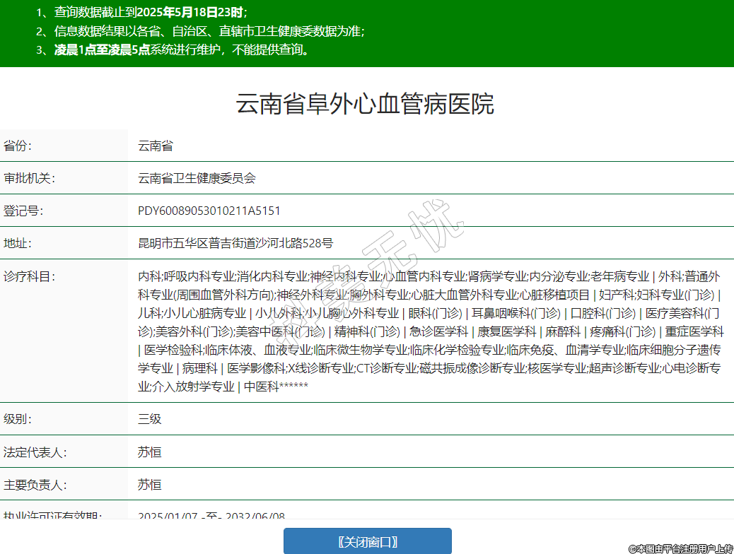 省份:云南省审批机关:云南省卫生健康委员会登记号:PDY60089053010211A5151地址:昆明市五华区普吉街道沙河北路528号诊疗科目:内科;呼吸内科专业;消化内科专业;神经内科专业;心血管内科专业;肾病学专业;内分泌专业;老年病专业 | 外科;普通外科专业(周围血管外科方向);神经外科专业;胸外科专业;心脏大血管外科专业;心脏移植项目 | 妇产科;妇科专业(门诊) | 儿科;小儿心脏病专业 | 小儿外科;小儿胸心外科专业 | 眼科(门诊) | 耳鼻咽喉科(门诊) | 口腔科(门诊) | 医疗美容科(门诊);美容外科(门诊);美容中医科(门诊) | 精神科(门诊) | 急诊医学科 | 康复医学科 | 麻醉科 | 疼痛科(门诊) | 重症医学科 | 医学检验科;临床体液、血液专业;临床微生物学专业;临床化学检验专业;临床免疫、血清学专业;临床细胞分子遗传学专业 | 病理科 | 医学影像科;X线诊断专业;CT诊断专业;磁共振成像诊断专业;核医学专业;超声诊断专业;心电诊断专业;介入放射学专业 | 中医科******级别:三级法定代表人:苏恒主要负责人:苏恒执业许可证有效期:2025/01/07 -至- 2032/06/08 -