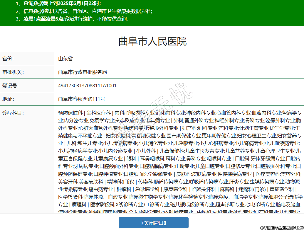 省份:山东省审批机关:曲阜市行政审批服务局登记号:49417303137088111A1001地址:曲阜市春秋西路111号诊疗科目:预防保健科 | 全科医疗科 | 内科;呼吸内科专业;消化内科专业;神经内科专业;心血管内科专业;血液内科专业;肾病学专业;内分泌专业;免疫学专业;变态反应专业;老年病专业 | 外科;普通外科专业;神经外科专业;骨科专业;泌尿外科专业;胸外科专业;心脏大血管外科专业;烧伤科专业;整形外科专业 | 妇产科;妇科专业;产科专业;计划生育专业;优生学专业;生殖健康与不孕症专业 | 妇女保健科;青春期保健专业;围产期保健专业;更年期保健专业;妇女心理卫生专业;妇女营养专业 | 儿科;新生儿专业;小儿传染病专业;小儿消化专业;小儿呼吸专业;小儿心脏病专业;小儿肾病专业;小儿血液病专业;小儿神经病学专业;小儿内分泌专业 | 小儿外科 | 儿童保健科;儿童生长发育专业;儿童营养专业;儿童心理卫生专业;儿童五官保健专业;儿童康复专业 | 眼科 | 耳鼻咽喉科;耳科专业;鼻科专业;咽喉科专业 | 口腔科;牙体牙髓病专业;口腔内科专业;牙周病专业;口腔颌面外科专业;口腔粘膜病专业;正畸专业;儿童口腔专业;口腔修复专业;口腔颌面外科专业;口腔预防保健专业;口腔种植专业;口腔颌面医学影像专业 | 皮肤科;皮肤病专业;性传播疾病专业 | 医疗美容科;美容外科;美容牙科;美容皮肤科 | 精神科(门诊) | 传染科;肠道传染病专业;呼吸道传染病专业;肝炎专业;虫媒传染病专业;动物源性传染病专业;蠕虫病专业 | 肿瘤科 | 急诊医学科 | 康复医学科 | 临终关怀科 | 麻醉科 | 疼痛科(门诊) | 重症医学科 | 医学检验科;临床体液、血液专业;临床微生物学专业;临床化学检验专业;临床免疫、血清学专业;临床细胞分子遗传学专业 | 病理科 | 医学影像科;X线诊断专业;CT诊断专业;磁共振成像诊断专业;超声诊断专业;心电诊断专业;脑电及脑血流图诊断专业;神经肌肉电图专业;介入放射学专业;放射治疗专业 | 中医科;内科专业;外科专业;妇产科专业;儿科专业;皮肤科专业;耳鼻咽喉科专业;口腔科专业;肿瘤科专业;骨伤科专业;肛肠科专业;针灸科专业;推拿科专业;康复医学专业;急诊科专业 | 中西医结合科******级别:二级法定代表人:孔令军主要负责人:孔令军执业许可证有效期:2024/12/17 -至- 2039/12/16 -