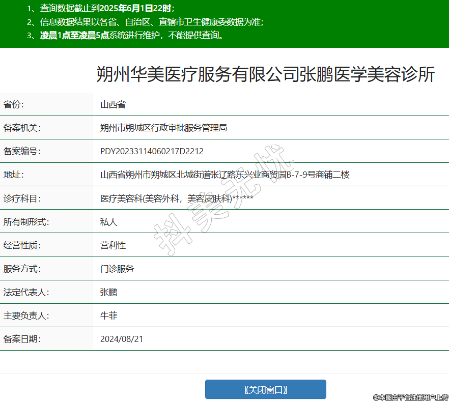 朔州华美医疗服务有限公司张鹏医学美容诊所,诊疗科目:医疗美容科(美容外科,美容皮肤科)******