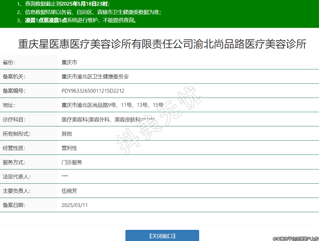 重庆星医惠医疗美容诊所有限责任公司渝北尚品路医疗美容诊所,诊疗科目:医疗美容科(美容外科、美容皮肤科)******