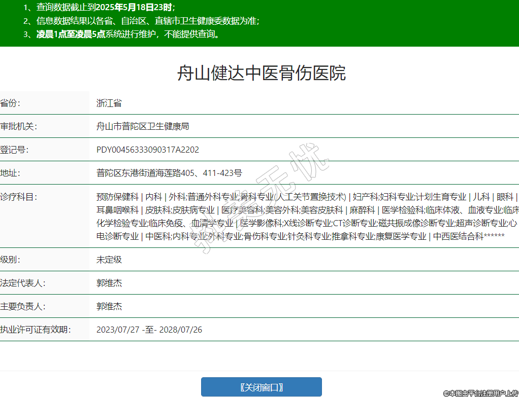 省份:浙江省审批机关:舟山市普陀区卫生健康局登记号:PDY00456333090317A2202地址:普陀区东港街道海莲路405、411-423号诊疗科目:预防保健科 | 内科 | 外科;普通外科专业;骨科专业(人工关节置换技术) | 妇产科;妇科专业;计划生育专业 | 儿科 | 眼科 | 耳鼻咽喉科 | 皮肤科;皮肤病专业 | 医疗美容科;美容外科;美容皮肤科 | 麻醉科 | 医学检验科;临床体液、血液专业;临床化学检验专业;临床免疫、血清学专业 | 医学影像科;X线诊断专业;CT诊断专业;磁共振成像诊断专业;超声诊断专业;心电诊断专业 | 中医科;内科专业;外科专业;骨伤科专业;针灸科专业;推拿科专业;康复医学专业 | 中西医结合科******级别:未定级法定代表人:郭维杰主要负责人:郭维杰执业许可证有效期:2023/07/27 -至- 2028/07/26 -