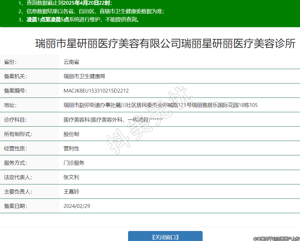 瑞丽市星研丽医疗美容有限公司瑞丽星研丽医疗美容诊所,诊疗科目:医疗美容科(医疗美容外科、一级项目)******