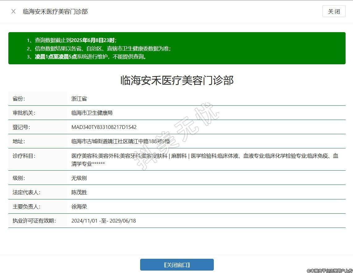 临海安禾医疗美容门诊部于2023年创建,位于台州市临海市古城街道靖江社区靖江中路188号9楼,是临海市卫健部门正规审批的医疗美容机构,开展:眼鼻整形、面部轮廊抗衰老等,秉承着安全整形、精益求精、专业专注的理念,为爱美人士安全美容严格把关。