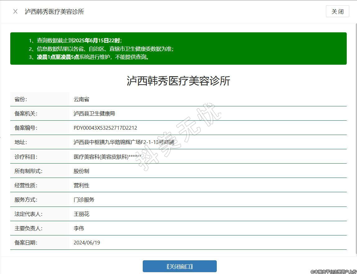泸西韩秀医疗美容诊所成立于2024年,位于泸西县中枢镇九华路锦辉广场F2-1-13号商铺,是一家经卫生部门批准设立的专业医疗美容机构,秉承"专业、安全、健康"的服务理念,配备专业医疗设备,由具备合法资质的医护人员操作,为求美者提供专业化的医疗美容服务。