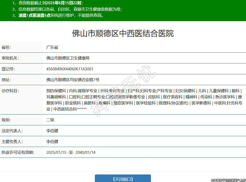 省份:广东省审批机关:佛山市顺德区卫生健康局登记号:45608496X44060611A3001地址:佛山市顺德区均安镇百安路7号诊疗科目:预防保健科 | 内科;肾病学专业 | 外科;骨科专业 | 妇产科;妇科专业;产科专业 | 妇女保健科 | 儿科 | 儿童保健科 | 眼科 | 耳鼻咽喉科 | 口腔科;口腔正畸专业;口腔颌面医学影像专业 | 皮肤科 | 医疗美容科 | 精神科 | 传染科 | 急诊医学科 | 康复医学科 | 职业病科 | 麻醉科 | 疼痛科 | 重症医学科 | 医学检验科 | 病理科(协议委托) | 医学影像科 | 中医科;针灸科专业 | 中西医结合科******级别:二级法定代表人:李伯健主要负责人:李伯健执业许可证有效期:2025/01/15 -至- 2040/01/14 -