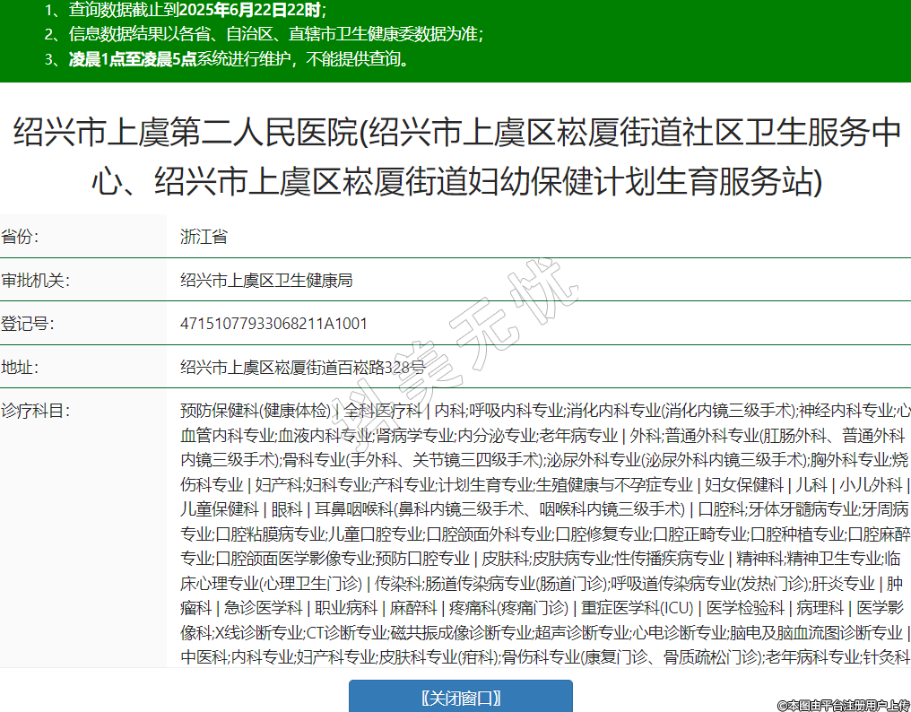 省份:浙江省审批机关:绍兴市上虞区卫生健康局登记号:47151077933068211A1001地址:绍兴市上虞区崧厦街道百崧路328号诊疗科目:预防保健科(健康体检) | 全科医疗科 | 内科;呼吸内科专业;消化内科专业(消化内镜三级手术);神经内科专业;心血管内科专业;血液内科专业;肾病学专业;内分泌专业;老年病专业 | 外科;普通外科专业(肛肠外科、普通外科内镜三级手术);骨科专业(手外科、关节镜三四级手术);泌尿外科专业(泌尿外科内镜三级手术);胸外科专业;烧伤科专业 | 妇产科;妇科专业;产科专业;计划生育专业;生殖健康与不孕症专业 | 妇女保健科 | 儿科 | 小儿外科 | 儿童保健科 | 眼科 | 耳鼻咽喉科(鼻科内镜三级手术、咽喉科内镜三级手术) | 口腔科;牙体牙髓病专业;牙周病专业;口腔粘膜病专业;儿童口腔专业;口腔颌面外科专业;口腔修复专业;口腔正畸专业;口腔种植专业;口腔麻醉专业;口腔颌面医学影像专业;预防口腔专业 | 皮肤科;皮肤病专业;性传播疾病专业 | 精神科;精神卫生专业;临床心理专业(心理卫生门诊) | 传染科;肠道传染病专业(肠道门诊);呼吸道传染病专业(发热门诊);肝炎专业 | 肿瘤科 | 急诊医学科 | 职业病科 | 麻醉科 | 疼痛科(疼痛门诊) | 重症医学科(ICU) | 医学检验科 | 病理科 | 医学影像科;X线诊断专业;CT诊断专业;磁共振成像诊断专业;超声诊断专业;心电诊断专业;脑电及脑血流图诊断专业 | 中医科;内科专业;妇产科专业;皮肤科专业(疳科);骨伤科专业(康复门诊、骨质疏松门诊);老年病科专业;针灸科专业;推拿科专业 | 中西医结合科******级别:二级法定代表人:俞栋主要负责人:章雪峰执业许可证有效期:2024/05/08 -至- 2036/06/30 -