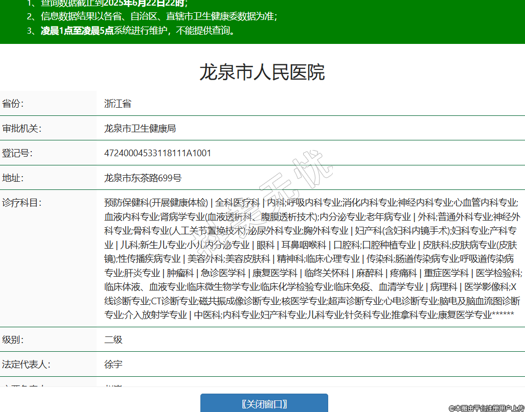 省份:浙江省审批机关:龙泉市卫生健康局登记号:47240004533118111A1001地址:龙泉市东茶路699号诊疗科目:预防保健科(开展健康体检) | 全科医疗科 | 内科;呼吸内科专业;消化内科专业;神经内科专业;心血管内科专业;血液内科专业;肾病学专业(血液透析科、腹膜透析技术);内分泌专业;老年病专业 | 外科;普通外科专业;神经外科专业;骨科专业(人工关节置换技术);泌尿外科专业;胸外科专业 | 妇产科(含妇科内镜手术);妇科专业;产科专业 | 儿科;新生儿专业;小儿内分泌专业 | 眼科 | 耳鼻咽喉科 | 口腔科;口腔种植专业 | 皮肤科;皮肤病专业(皮肤镜);性传播疾病专业 | 美容外科;美容皮肤科 | 精神科;临床心理专业 | 传染科;肠道传染病专业;呼吸道传染病专业;肝炎专业 | 肿瘤科 | 急诊医学科 | 康复医学科 | 临终关怀科 | 麻醉科 | 疼痛科 | 重症医学科 | 医学检验科;临床体液、血液专业;临床微生物学专业;临床化学检验专业;临床免疫、血清学专业 | 病理科 | 医学影像科;X线诊断专业;CT诊断专业;磁共振成像诊断专业;核医学专业;超声诊断专业;心电诊断专业;脑电及脑血流图诊断专业;介入放射学专业 | 中医科;内科专业;妇产科专业;儿科专业;针灸科专业;推拿科专业;康复医学专业******级别:二级法定代表人:徐宇主要负责人:赵嵩执业许可证有效期:2022/02/10 -至- 2037/02/09 -
