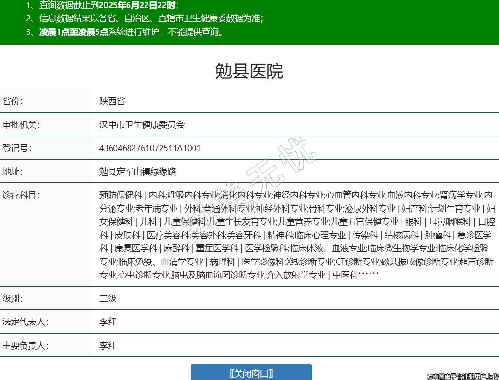 省份:陕西省审批机关:汉中市卫生健康委员会登记号:43604682761072511A1001地址:勉县定军山镇绿缘路诊疗科目:预防保健科 | 内科;呼吸内科专业;消化内科专业;神经内科专业;心血管内科专业;血液内科专业;肾病学专业;内分泌专业;老年病专业 | 外科;普通外科专业;神经外科专业;骨科专业;泌尿外科专业 | 妇产科;计划生育专业 | 妇女保健科 | 儿科 | 儿童保健科;儿童生长发育专业;儿童营养专业;儿童五官保健专业 | 眼科 | 耳鼻咽喉科 | 口腔科 | 皮肤科 | 医疗美容科;美容外科;美容牙科 | 精神科;临床心理专业 | 传染科 | 结核病科 | 肿瘤科 | 急诊医学科 | 康复医学科 | 麻醉科 | 重症医学科 | 医学检验科;临床体液、血液专业;临床微生物学专业;临床化学检验专业;临床免疫、血清学专业 | 病理科 | 医学影像科;X线诊断专业;CT诊断专业;磁共振成像诊断专业;超声诊断专业;心电诊断专业;脑电及脑血流图诊断专业;介入放射学专业 | 中医科******级别:二级法定代表人:李红主要负责人:李红执业许可证有效期:2022/12/09 -至- 2027/12/08 -
