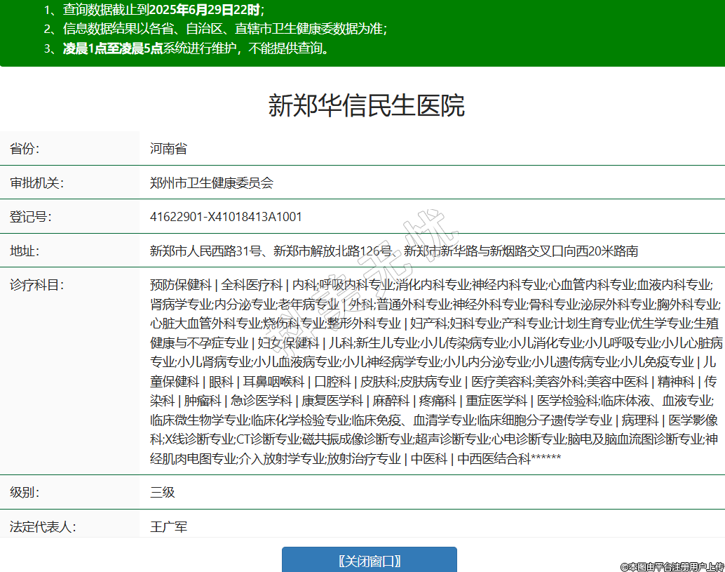 省份:河南省审批机关:郑州市卫生健康委员会登记号:41622901-X41018413A1001地址:新郑市人民西路31号、新郑市解放北路126号、新郑市新华路与新烟路交叉口向西20米路南诊疗科目:预防保健科 | 全科医疗科 | 内科;呼吸内科专业;消化内科专业;神经内科专业;心血管内科专业;血液内科专业;肾病学专业;内分泌专业;老年病专业 | 外科;普通外科专业;神经外科专业;骨科专业;泌尿外科专业;胸外科专业;心脏大血管外科专业;烧伤科专业;整形外科专业 | 妇产科;妇科专业;产科专业;计划生育专业;优生学专业;生殖健康与不孕症专业 | 妇女保健科 | 儿科;新生儿专业;小儿传染病专业;小儿消化专业;小儿呼吸专业;小儿心脏病专业;小儿肾病专业;小儿血液病专业;小儿神经病学专业;小儿内分泌专业;小儿遗传病专业;小儿免疫专业 | 儿童保健科 | 眼科 | 耳鼻咽喉科 | 口腔科 | 皮肤科;皮肤病专业 | 医疗美容科;美容外科;美容中医科 | 精神科 | 传染科 | 肿瘤科 | 急诊医学科 | 康复医学科 | 麻醉科 | 疼痛科 | 重症医学科 | 医学检验科;临床体液、血液专业;临床微生物学专业;临床化学检验专业;临床免疫、血清学专业;临床细胞分子遗传学专业 | 病理科 | 医学影像科;X线诊断专业;CT诊断专业;磁共振成像诊断专业;超声诊断专业;心电诊断专业;脑电及脑血流图诊断专业;神经肌肉电图专业;介入放射学专业;放射治疗专业 | 中医科 | 中西医结合科******级别:三级法定代表人:王广军主要负责人:***执业许可证有效期:2024/12/23 -至- 2038/01/14 -