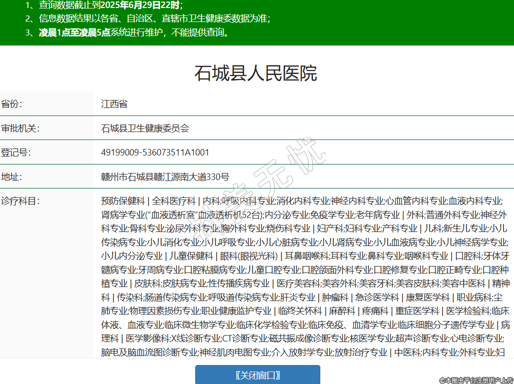 省份:江西省审批机关:石城县卫生健康委员会登记号:49199009-536073511A1001地址:赣州市石城县赣江源南大道330号诊疗科目:预防保健科 | 全科医疗科 | 内科;呼吸内科专业;消化内科专业;神经内科专业;心血管内科专业;血液内科专业;肾病学专业(“血液透析室”血液透析机52台);内分泌专业;免疫学专业;老年病专业 | 外科;普通外科专业;神经外科专业;骨科专业;泌尿外科专业;胸外科专业;烧伤科专业 | 妇产科;妇科专业;产科专业 | 儿科;新生儿专业;小儿传染病专业;小儿消化专业;小儿呼吸专业;小儿心脏病专业;小儿肾病专业;小儿血液病专业;小儿神经病学专业;小儿内分泌专业 | 儿童保健科 | 眼科(眼视光科) | 耳鼻咽喉科;耳科专业;鼻科专业;咽喉科专业 | 口腔科;牙体牙髓病专业;牙周病专业;口腔粘膜病专业;儿童口腔专业;口腔颌面外科专业;口腔修复专业;口腔正畸专业;口腔种植专业 | 皮肤科;皮肤病专业;性传播疾病专业 | 医疗美容科;美容外科;美容牙科;美容皮肤科;美容中医科 | 精神科 | 传染科;肠道传染病专业;呼吸道传染病专业;肝炎专业 | 肿瘤科 | 急诊医学科 | 康复医学科 | 职业病科;尘肺专业;物理因素损伤专业;职业健康监护专业 | 临终关怀科 | 麻醉科 | 疼痛科 | 重症医学科 | 医学检验科;临床体液、血液专业;临床微生物学专业;临床化学检验专业;临床免疫、血清学专业;临床细胞分子遗传学专业 | 病理科 | 医学影像科;X线诊断专业;CT诊断专业;磁共振成像诊断专业;核医学专业;超声诊断专业;心电诊断专业;脑电及脑血流图诊断专业;神经肌肉电图专业;介入放射学专业;放射治疗专业 | 中医科;内科专业;外科专业;妇产科专业;儿科专业;皮肤科专业;肿瘤科专业;骨伤科专业;肛肠科专业;老年病科专业;针灸科专业;推拿科专业;康复医学专业;急诊科专业;预防保健科专业 | 中西医结合科******级别:三级法定代表人:吴优明主要负责人:吴优明执业许可证有效期:2024/07/01 -至- 2029/06/30 -